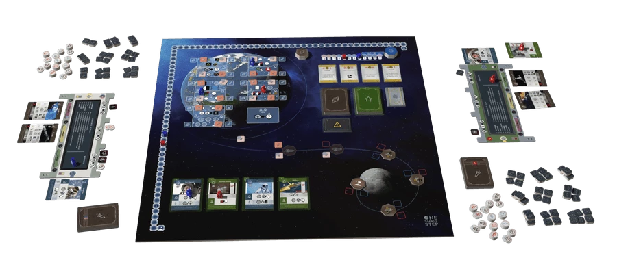 Lead the United States or Soviet Union Space Agency in this engine building, worker placement, race for the moon Eurogame.