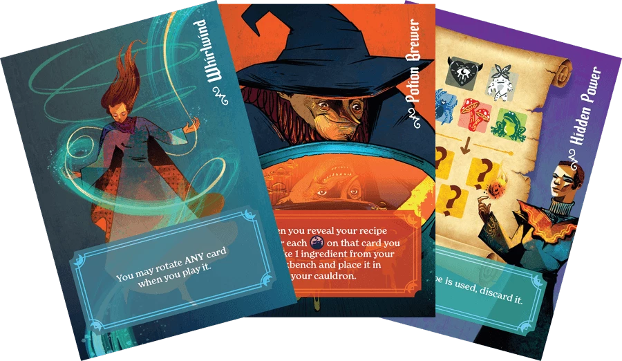 The game includes personality cards you can use to give each player a unique power, in addition to a different set of starting ingredients. Some recipes can be played in either of two directions to help you customize how you transform ingredients, and recipes might also have arcana symbols that give you bonus powers when you collect enough of them.