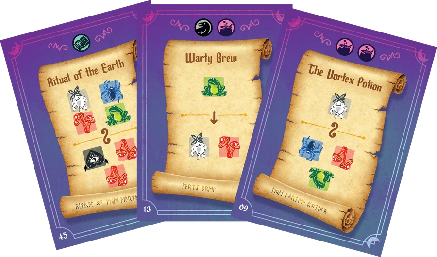 If you now have at least five ingredients in your Witch’s Circle, the game ends and you win; otherwise you all pass your recipe cards in hand to the player on your left, refill your hand to four cards, then start a new round.