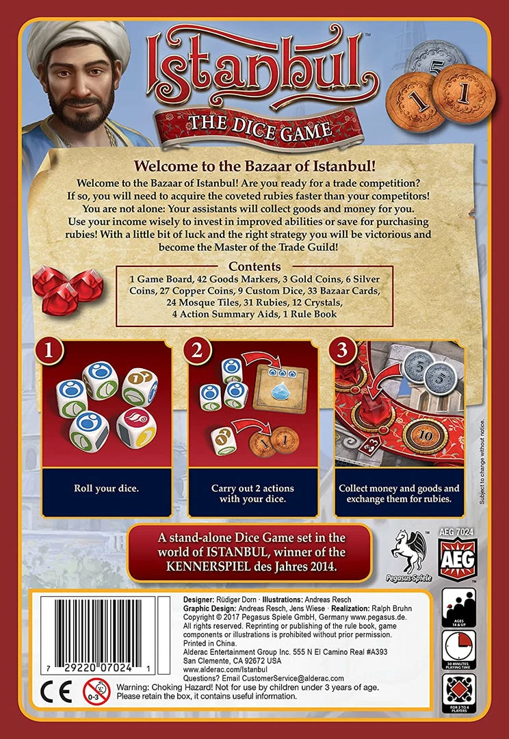 Istanbul: Dice is a standalone dice game in which players are once again plunging into the bustle of Istanbul’s bazaar to collect rubies and thus secure their victory. By cleverly using the dice, the players can make money and goods, then exchange them for the precious jewels.