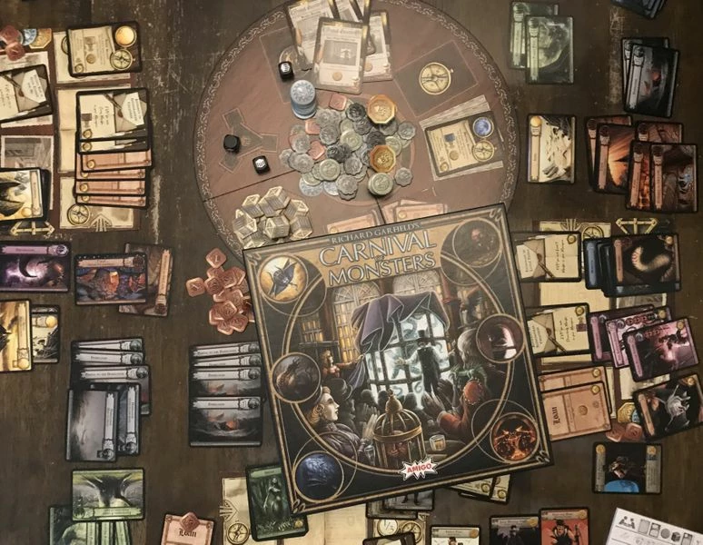 Carnival of Monsters is a card-drafting game in which players try to collect sets of Land Cards so they can capture and display strange and exotic Monsters, hire talented Staff to help run their enterprise, and pursue their own Secret Goals. Points are awarded for displaying Monsters, completing Goals, and earning Gold Crowns (Crowns) over four βSeasonsβ of play.