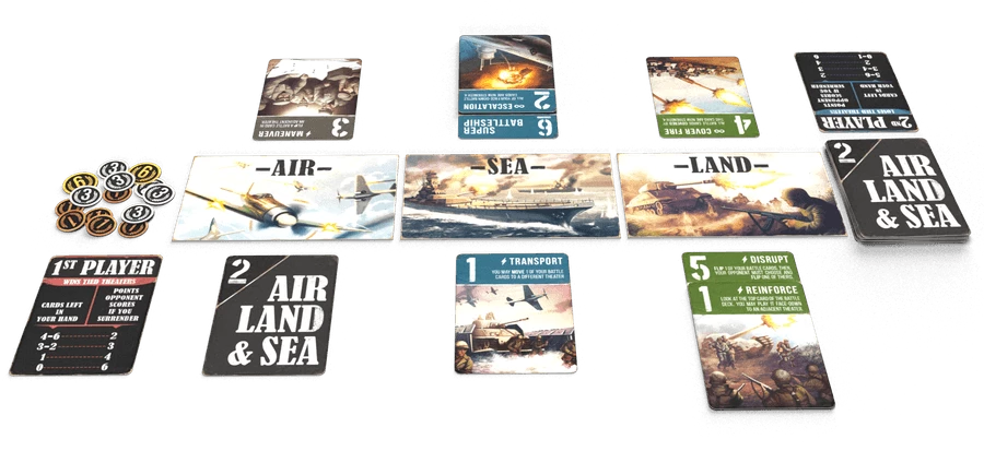 In Air, Land, & Sea, two players participate in a series of Battles, with the objective to control two of the three Theaters of war after both players have played all of their Battle cards, or convince your opponent to withdraw!