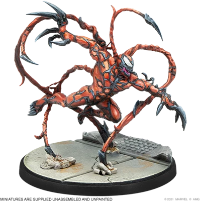 Marvel: Crisis Protocol โ Mysterio & Carnageย consists of 2 miniatures, 2 Bases, 2 Character Stat Cards, 3 Team Tactic Cards, and 11 Tokens.