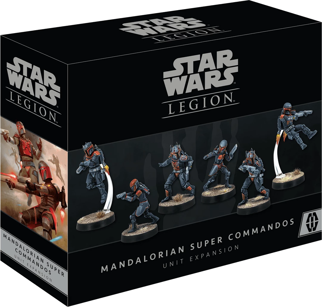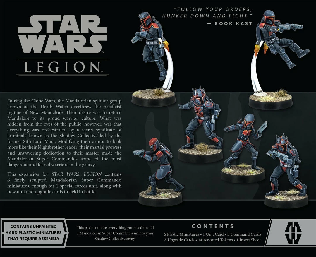 Mandalorian Super Commandos bend the galaxy to Maulβs will in this expansion for Star Wars: Legion! Previously members of the notorious Death Watch, these elite Mandalorian warriors now follow Maul because he wields the Darksaber. With them, players have a powerful new special forces option for their Shadow Collective forces. In addition to six Mandalorian Super Commando miniatures and a unit card, players will also find three command cards specifically designed for use with mercenary units in this expansion as well as eight upgrade cards that invite them to customize their units with heavy weapons, new gear, and more!