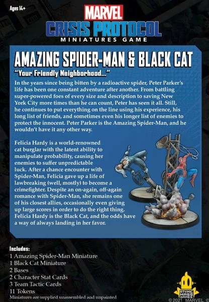 Marvel: Crisis Protocol β Amazing Spider-Man & Black CatΒ consists of 2 miniatures, 2 Bases, 2 Character Stat Cards, 3 Team Tactic Cards, and 11 Tokens.