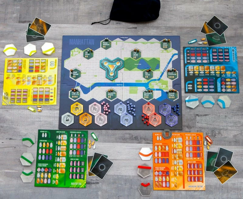 Efficiency is your key to success in this pick-up-and-deliver, tile-laying, engine-building game. Transparent tiles allow your route to overlap your opponents’ tracks, winding you along from station to station. Robots efficiently upgrade and adjust your abilities, leveraging unique goals to maximize points. By the end of the game, the game board has morphed into a modern subway map, with brightly-colored routes connecting stations all over the city.