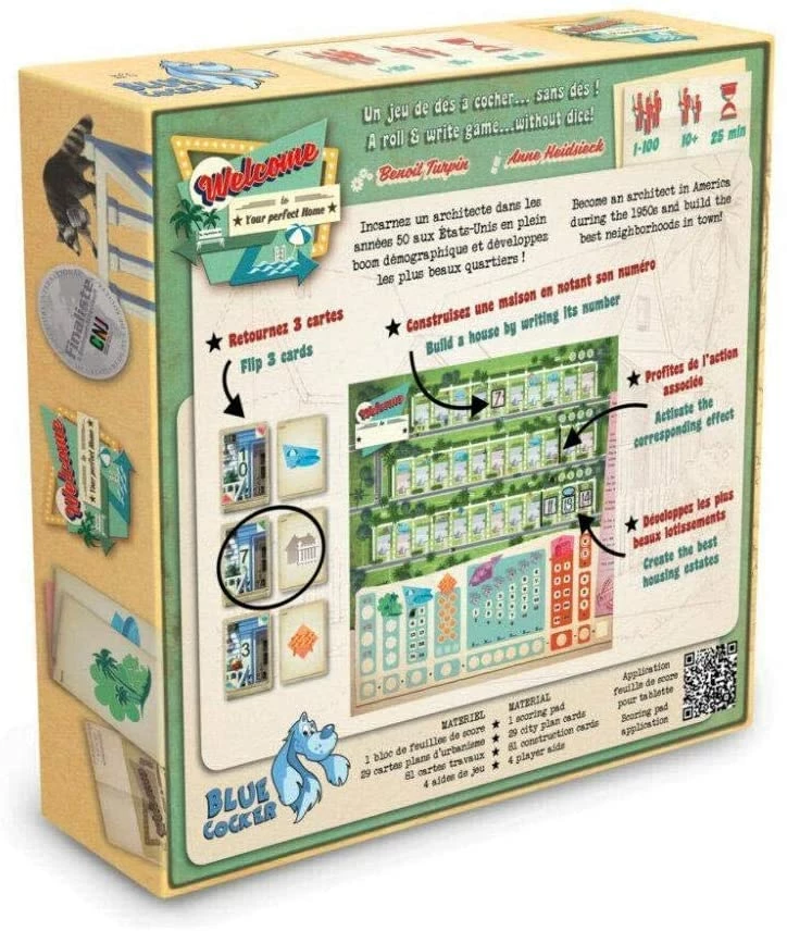 Welcome To… plays like a roll-and-write dice game in which you mark results on a score-sheet…but without dice. Instead you flip cards from three piles to make three different action sets with both a house number and a corresponding action from which everyone chooses one. You use the number to fill in a house on your street in numerical order. Then you take the action to increase the point value of estates you build or score points at the end for building parks and pools. Players also have the option of taking actions to alter or duplicate their house numbers. And everyone is racing to be the first to complete public goals. There’s lots to do and many paths to becoming the best suburban architect in Welcome To…!