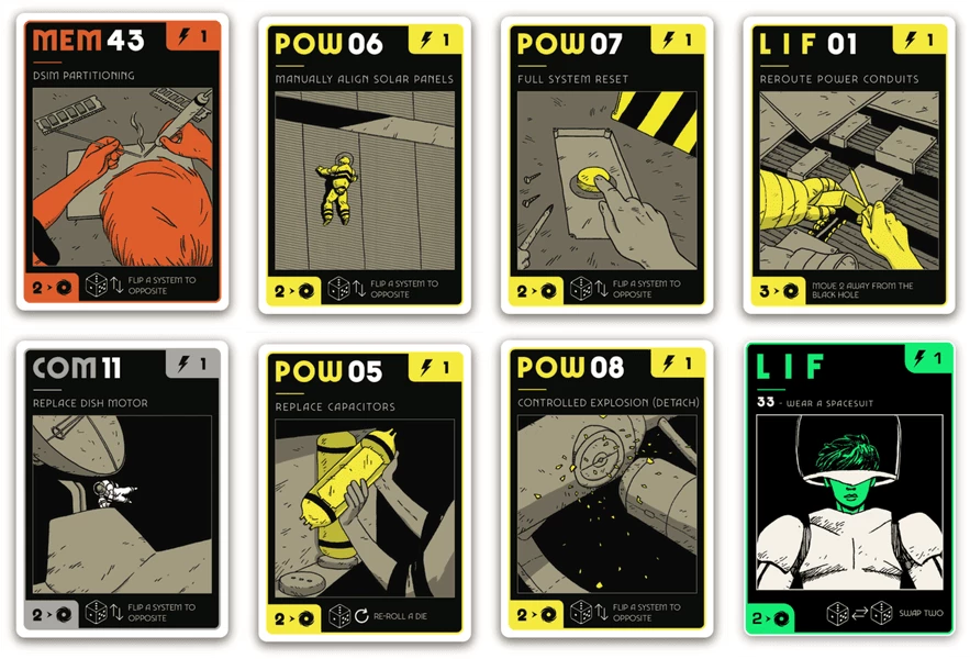 Your challenge inΒ Lux AeternaΒ is to draw and play all of the cards in the main deck, one turn after another, without the spaceship collapsing completely or falling into the black hole. Cards have multiple functions; you will assign drawn cards to one each of these functions each turn: