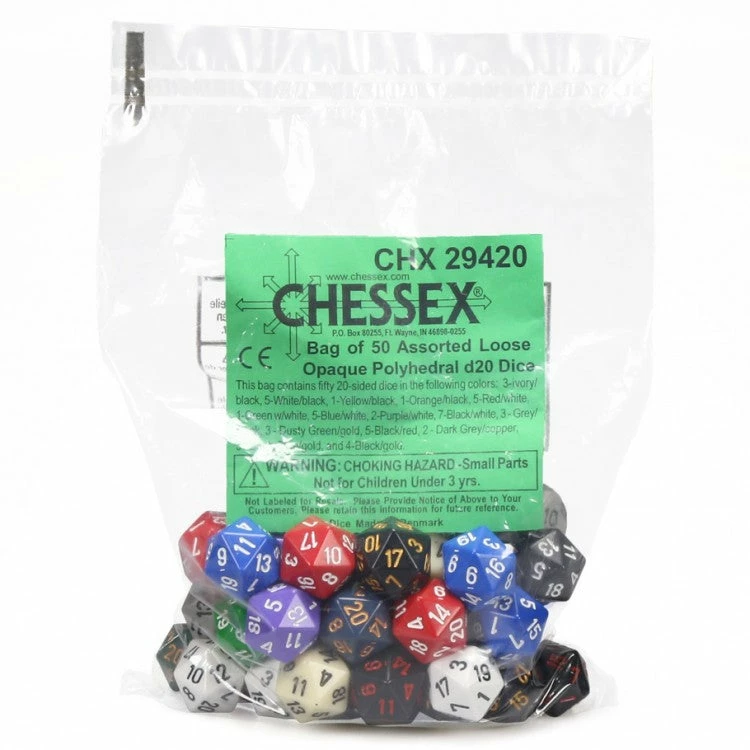 Bag of 50 Assorted Loose Opaque D20 Dice (Chessex 29420)