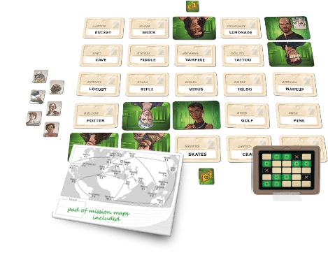 To set up play, lay out 25 word cards in a 5Γ5 grid. Place a key card in the holder so that each player sees one side of the card. Each player sees a 5Γ5 grid on the card, with nine of the squares colored green (representing your agents) and three squares colored black (representing assassins). Three of the nine squares on each side are also green on the other side, one assassin is black on both sides, one is green on the other side and the other is an innocent bystander on the other side.