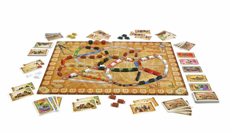Players take turns until someone has no more than two carts in their supply, then each player takes one final turn, including the player who triggered the end of the game. Players then sum their points, scoring points for the routes that they’ve claimed during the game, the trade contract tickets that they’ve completed (by connecting the two locations on a ticket by a continuous line of their carts), and their standing among those who hold merchandise bonus cards. Whoever holds the most cards collects 8 points, with other players collecting fewer points. You lose points for any uncompleted contract tickets, then whoever has the high score wins!