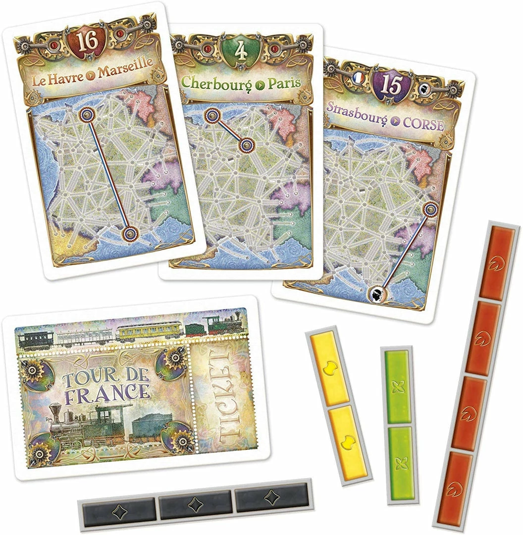 In the France half of this expansion, 2-5 players collect train cards and claim routes in order to complete tickets in hand, but most of the tracks on the board aren’t colored! Each time that you draw cards, you must take a colored tile that’s 2-5 train cars long and place that tile on an empty track bed. Once you’ve done this, any player can claim that route by discarding the appropriately colored cards from hand, as in any other Ticket to Ride game. (Single-length routes are already colored, and the map contains a number of gray-colored ferry routes.)