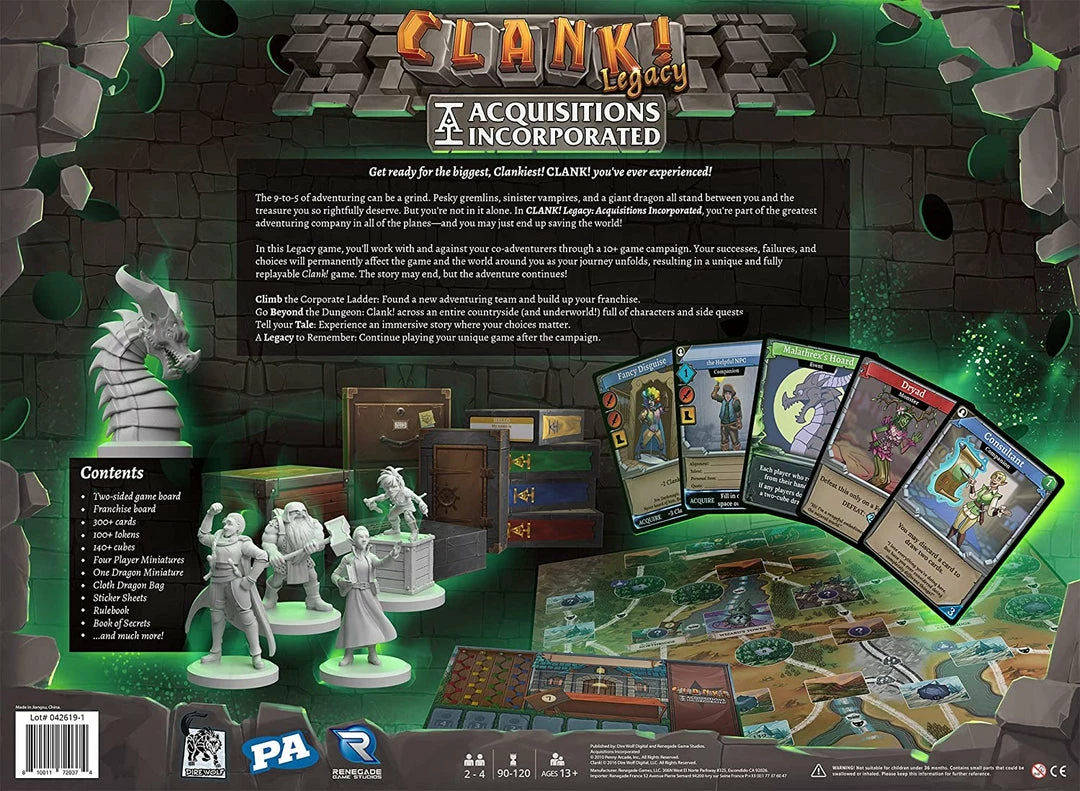 Clank! Legacy: Acquisitions Incorporated extends the deck-building fun of Clank! with legacy-style gameplay! Found your own franchise of the legendary adventuring company Acquisitions Incorporated, and shepherd your fledgling treasure-hunters to immortal corporate glory over the course of multiple games. Your game board, your deck, and your world change as you play to create a unique campaign tailored to your adventuring party. Be cunning, be bold, and most importantly be ready…