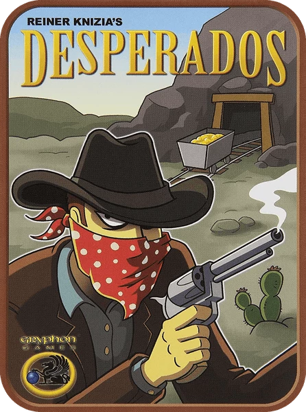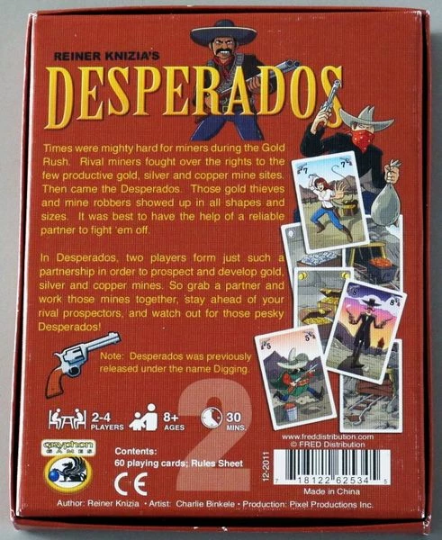 DesperadosΒ is a partnership game where players in teams of two must work together to get the most points. InΒ Reiner Knizia’sΒ first published game, there are nine mine-opening cards and nine mine-closing cards. To score any points you’ve got to play gold, silver or copper cards onto the corresponding open mine and then close it. Trouble is, your opponents can close your mine before you want or even try to steal it with bandit cards — a tough gauntlet to run, but here and there a few points trickle through and into the scoring column. On your turn you either play a card OR draw a card — not both — making this rapid-fire card game move at its own special pace, which is very quickly indeed. It was designed primarily for partnership play, and appreciated best by players with good partnership skills. For players who do not want a partnership experience, there are variations for 2 or 3 players.