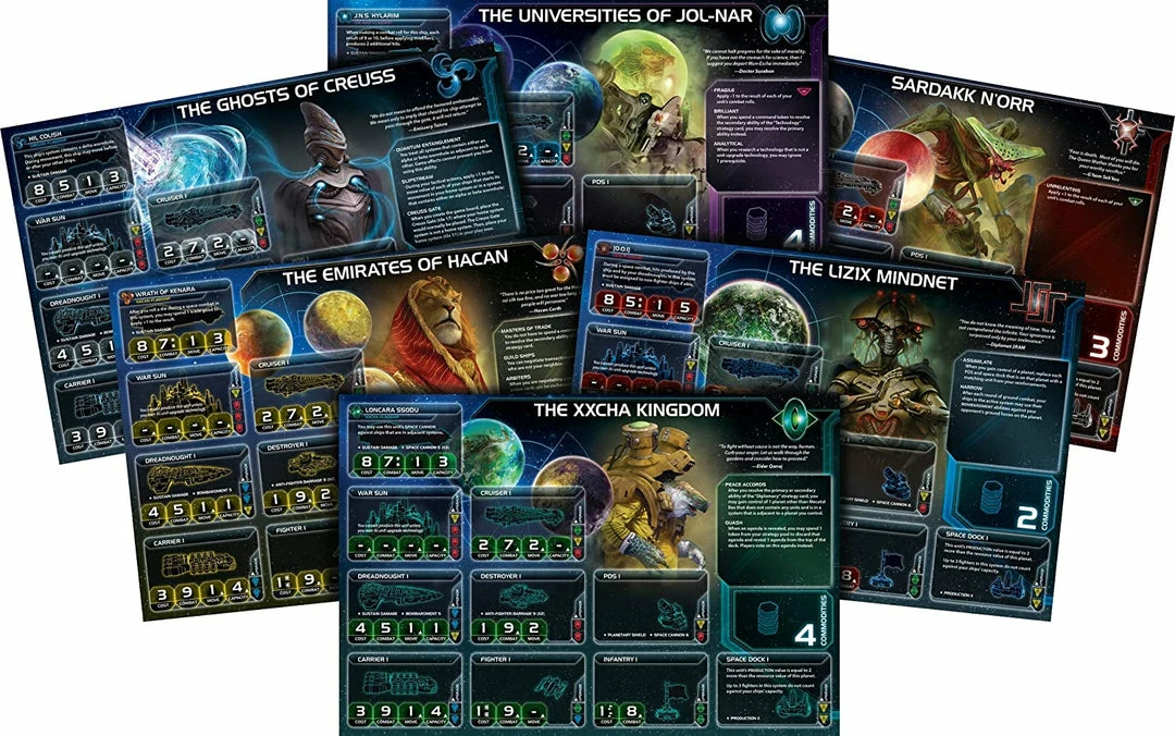 Twilight Imperium (Fourth Edition) is a game of galactic conquest in which three to six players take on the role of one of seventeen factions vying for galactic domination through military might, political maneuvering, and economic bargaining. Every faction offers a completely different play experience, from the wormhole-hopping Ghosts of Creuss to the Emirates of Hacan, masters of trade and economics. These seventeen races are offered many paths to victory, but only one may sit upon the throne of Mecatol Rex as the new masters of the galaxy.