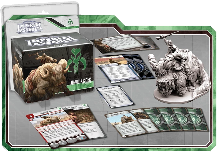 The indigenous people of Tatooine, the Tusken Raiders, are known for their lightning-fast raids and ferocious battle tactics as they attack Tatooineβs moisture farmers. The Tusken Raiders are also known for riding out of the desert on banthas β massive, horned beasts that can easily trample those who anger them. With the Bantha Rider Villain Pack, you have the opportunity to swell the forces of the Tusken Raiders from Twin Shadows and ride a bantha into battle in Imperial Assault.