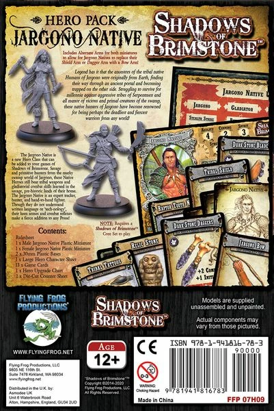 Includes Male and Female Jargono Native miniatures in high-detail resin, two 30mm plastic bases, Jargono Native Double-Sided Hero Character Sheet, Rulesheet, Jargono Native Upgrade Chart, Starting Upgrade Cards, and Starting Gear.