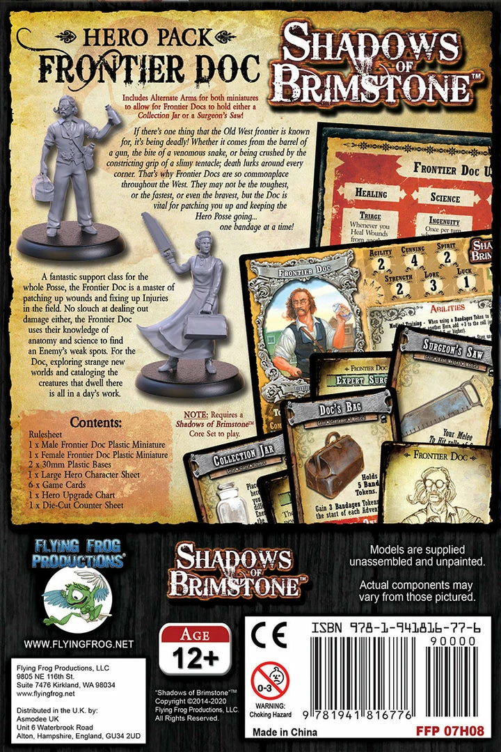 Includes Male and Female Frontier Doc miniatures in high-detail resin, two 30mm plastic bases, Frontier Doc Double-Sided Hero Character Sheet, Rulesheet, Frontier Doc Upgrade Chart, Starting Upgrade Cards, and Starting Gear.