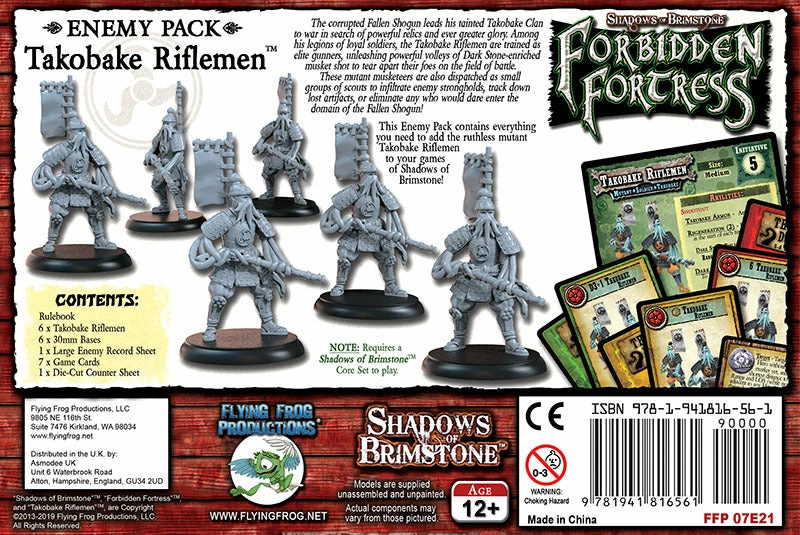 ย ย This Enemy Pack contains everything you need to add the ruthless mutant Takobake Riflemen to your games of Shadows of Brimstone! There are 6 Takobake Riflemen models, as well as the large Enemy Record Sheet for them, die-cut counters, and all of the Threat Cards needed to add them to your games.