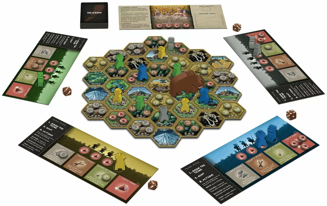 InΒ Tusk!, you and your fellow players will need to team up to hunt successfully β but there can be only one master of the hunt, and to ensure that’s you and your tribe, you need to manipulate alliances, horde supplies, and make use of the land’s many resources to become the most powerful tribe. The game ends when snow covers the entire playing area, and the tribe with the most food wins!