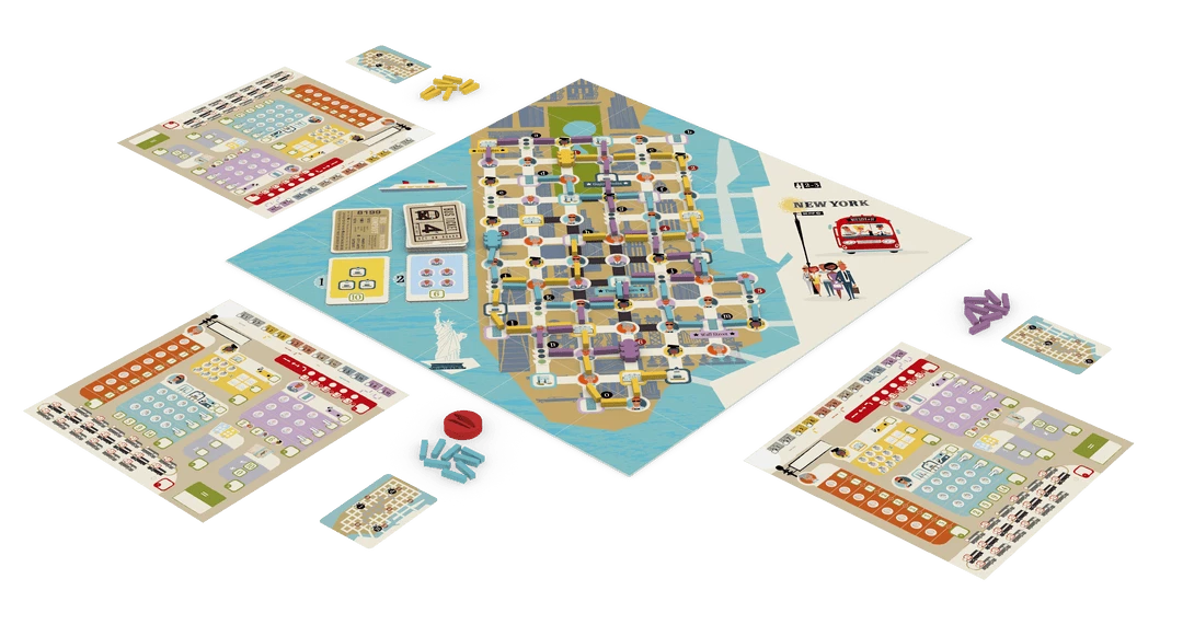 In Get on Board: New York & London, you have twelve rounds in which to build the best bus line in town. Each round reveals a new card that shows each player the route shape they must complete. Place your bus accordingly on the central board. Take the passengers where they want to go by connecting them and their destination to your bus line, avoid traffic, and gain as many victory points as possible!