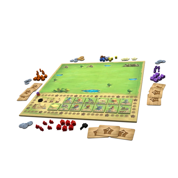 In the game, which lasts four rounds, you can acquire resources such as wood, stones, fish, and wheat from the surrounding squares by putting workers on the board, with three workers being placed each round. When you place a worker, you acquire the resources available in all eight surrounding spaces. You can build buildings by using these resources, and you β or any other player β can gain the effect of the building when place a worker next to it; if you place next to a building owned by another, however, you must pay them a coin before you can collect those resources.
