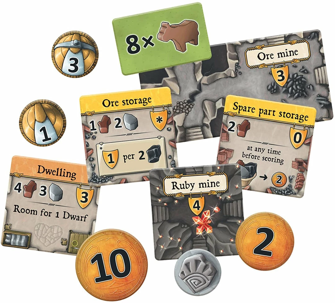 It’s up to you how much ore you want to mine. You will need it to forge weapons that allow you to go on expeditions to gain bonus items and actions. While digging through the mountain, you may come across water sources and find ore and ruby mines that help you increase your wealth. Right in front of your cave, you can increase your wealth even further with agriculture: You can cut down the forest to sow fields and fence in pastures to hold your animals. You can also expand your family while running your ever-growing farm. In the end, the player with the most efficiently developed home board wins.