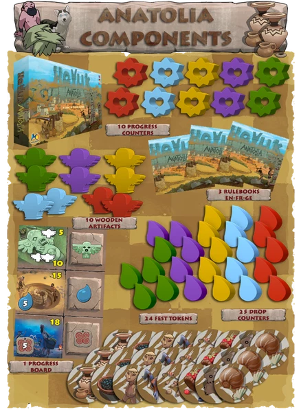 Inย Hoyuk, each player represents a clan that settles with other clans to erect a village. During the game, a replica of a Neolithic settlement will be built on theย Hรถyรผkย board using tiles that represent houses. Many additional pieces (such as ovens, shrines, and pens) will also aid a player in building his settlements.