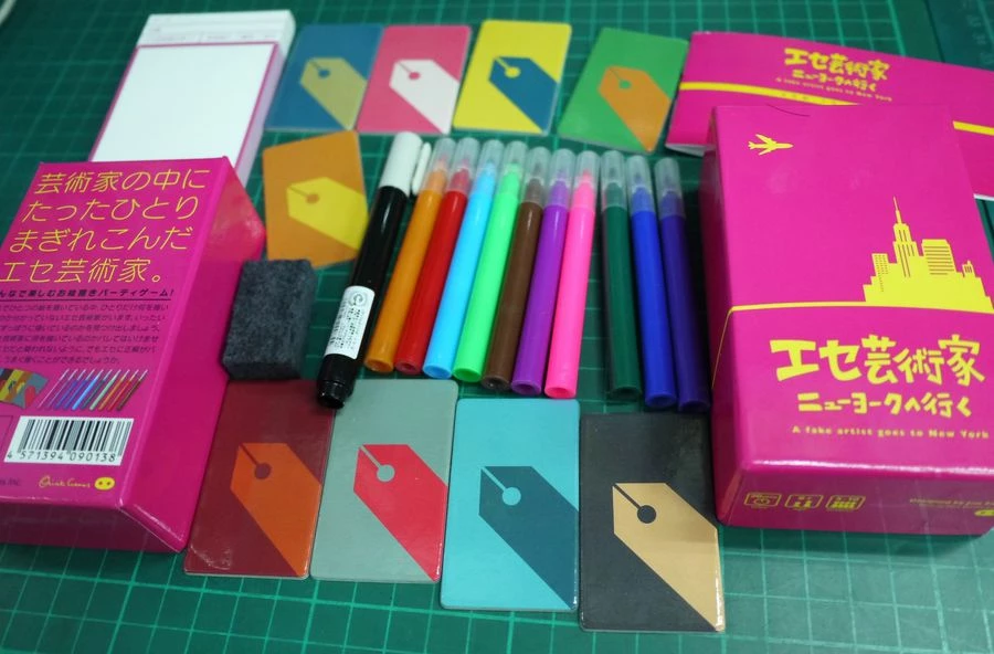 ใจใป่ธ่กๅฎถใใฅใผใจใผใฏใธ่กใย โ which is pronounced as “Ese Geijutsuka New York e Iku” and can be translated asย Fake Artist Goes to New Yorkย โ is a party game for 5-10 players. Players take turns being the Question Master, whose role is to set a category, write a word within that category on dry erase cards, and hand those out to other players as artists. At the same time, one player will have only an “X” written on his card: they are the fake artist!