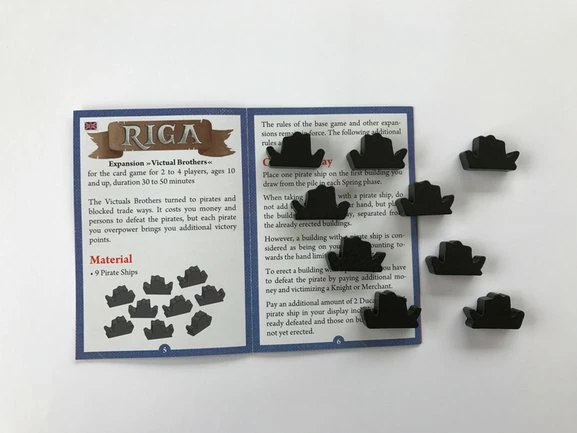 Nine Pirate ships enter the game of Riga in the Die Vitalienbrüder expansion and make it more expensive to build some of the building cards. You have to pay more every time you take a building with a Pirate ship, but you gain additional victory points in the game end scoring for each ship you defeat. The problem is that Pirates eliminate figures (knight, merchant) on your cards, too!