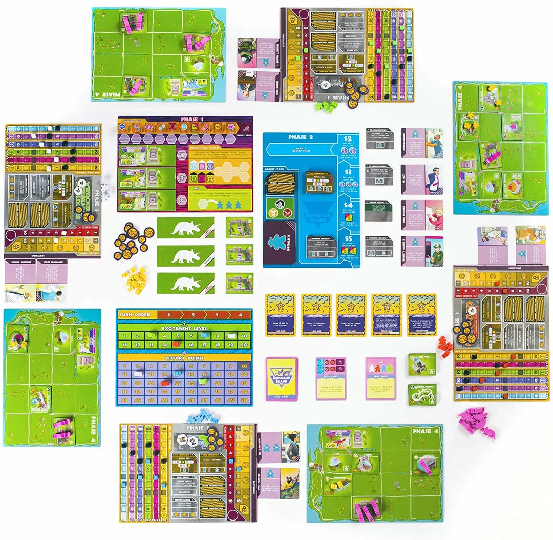 InΒ Dinosaur Island, players will have to collect DNA, research the DNA sequences of extinct dinosaur species, and then combine the ancient DNA in the correct sequence to bring these prehistoric creatures back to life. Dino cooking! All players will compete to build the most thrilling park each season, and then work to attract (and keep alive!) the most visitors each season that the park opens.