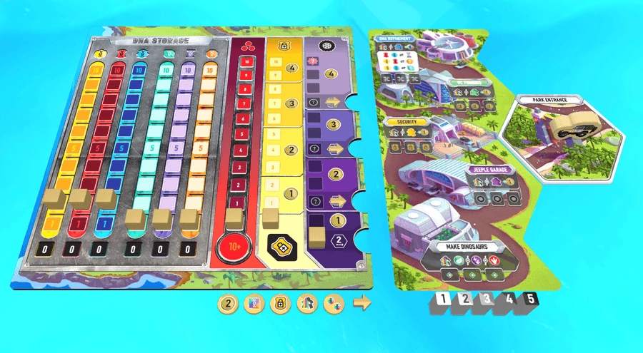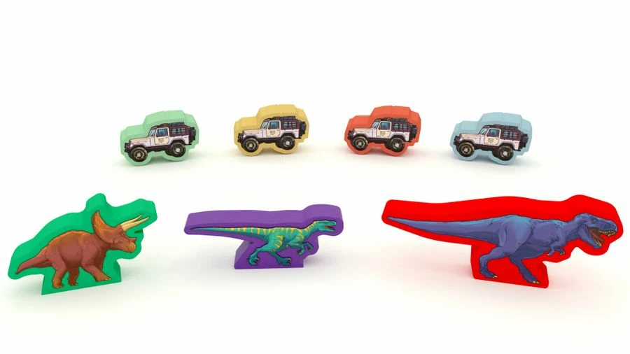 Each round inย Dinosaur World, you draft a new rรฉsumรฉ card to acquire new workers; spend workers to take public actions building your park and acquiring DNA; spend further workers to take private actions improving that park; then drive your jeep around experiencing the wonder and excitement of what you have built! Throughout the game you acquire victory points through a variety of means โ and possibly a few visitor deaths as a natural consequence of overly enthusiastic dinosaur encounters. At the end of the game, you lose points if you accumulated too many deaths, then the player with the most points wins!