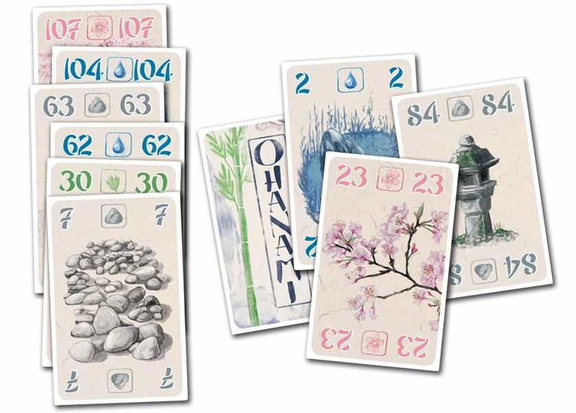 OhanamiΒ consists of a deck of 120 cards that are numbered from 1-120, with each card having one of four symbols on it. The game lasts three rounds, with players scoring at the end of each round, in addition to bonus scoring at the end of the game.