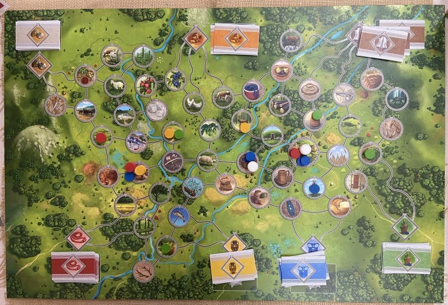 The Celtic Lord of the Wetterau is looking for a successor. To prove themselves worthy, players have to travel the region and trade with neighboring tribes. Each turn they have to perform one movement with their family members; other players at their starting location can decide to join them. While some locations allow players to collect goods, others have to be visited to fulfill goal cards which grant influence (victory points). The game ends immediately once a player has fulfilled five goal cards or chooses to reveal that they’ve collected one good of every kind. Players then tally up their points and the most influential Celt wins.