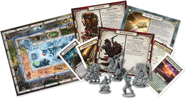 The CataclysmΒ introduces a new center board that opens up a reinvented, post-apocalyptic realm for your exploration. Those brave enough to inhabit this world are brought to life in the Denizens deck, while the Remnants deck fills spaces with lost treasures, broken artifacts, and the lingering after-effects of the apocalypse. Five more characters now seek the Crown of Command, including the Black Knight who once menaced the Middle Region, and four alternative endings shape your quests in this ever-changing world.