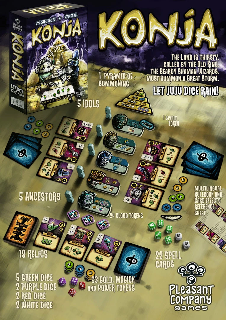 KonjaΒ is a press-your-luck and resource management dice game in which 2 players compete as wizards, summoned by an old king to manifest a great storm and bring rain to a dry land. By rolling dice and activating powerful spells and relics cards, players gain Gold, Magick, Power, and Clouds.