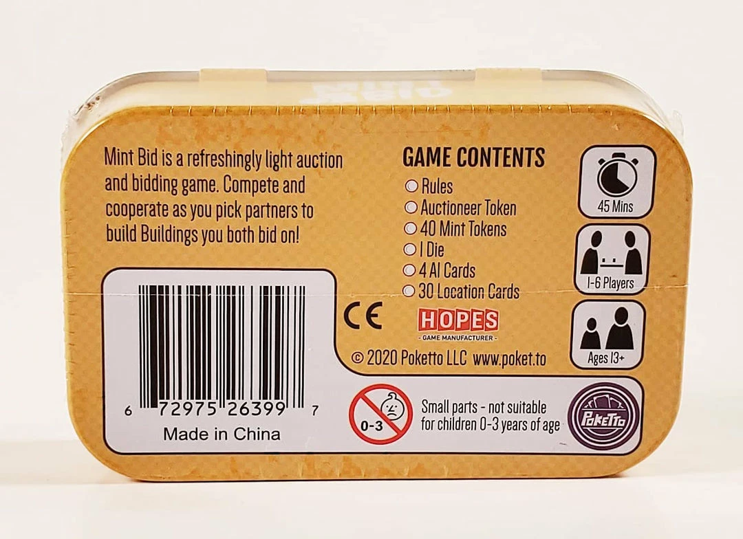 The game’s compact size makes it easy to put in your pocket and take anywhere. Couple that with its simple rules and setup, and Mint Bid is like carrying a party in your pocket!