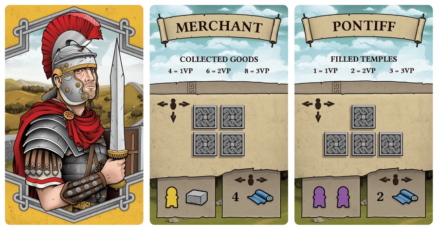 Inย Hadrian’s Wall, players take on the role of a Roman General placed in charge of the construction of a milecastle and bordering wall. Over six years (rounds), players will construct their fort and wall, man the defenses, and attract civilians by building services and providing entertainment โ all while defending the honor of the Roman Empire from the warring Picts. The player who can accumulate the most renown, piety, valor and discipline, whilst avoiding disdain, will prove to the Emperor they are the model Roman citizen and be crowned Legatus Legionis!