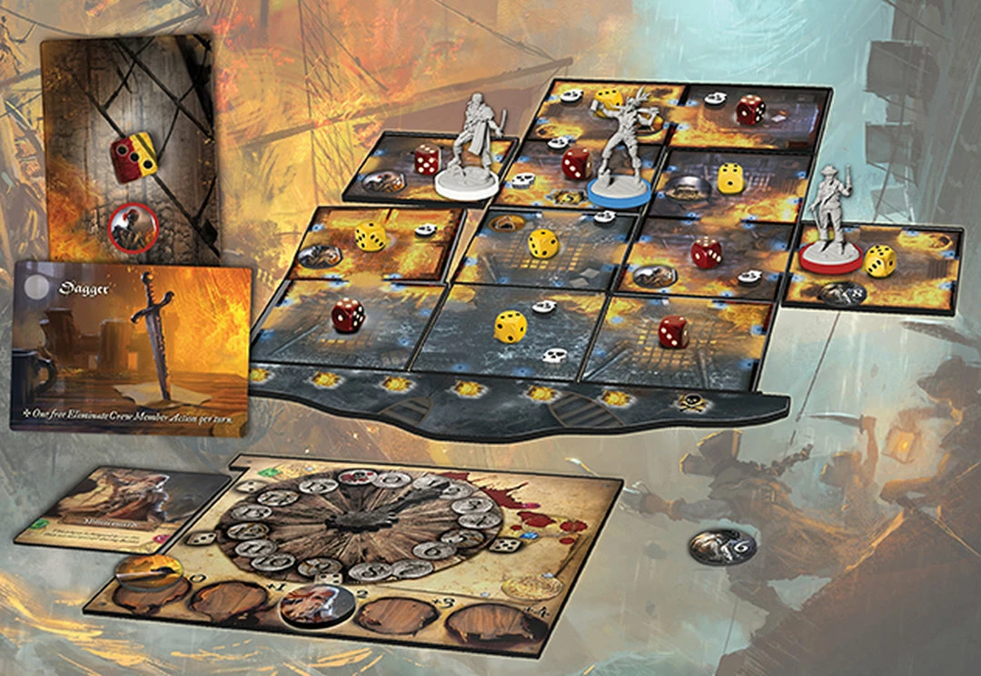 Dead Men Tell No Tales is a co-operative game for 2-5 players. The game uses the common Action Point system to determine what a player does on their turn…with a twist. As players work together, they can pass their Actions on to their teammates in order to best utilize the assets that they have. Players will build the board as they play, ensuring that no two games will ever be alike. As they search the ship for the Treasure, they will encounter Enemies and Guards that they must battle, along with various items that will help them in their quest. all the while, battling the inferno that resulted when they took over the ship. Unique systems for tracking fire, enemy movement, and a playerβs fatigue all combine into an interesting and unique cooperative gaming experience.
