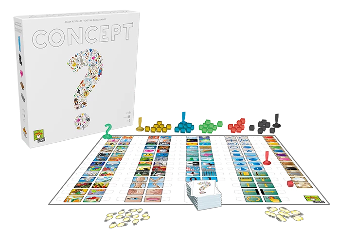 In Concept, your goal is to guess words through the association of icons. A team of two players โ neighbors at the table โ choose a word or phrase that the other players need to guess. Acting together, this team places pieces judiciously on the available icons on the game board.