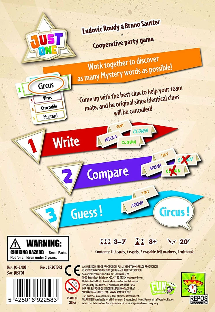 Just One is a cooperative party game in which you play together to discover as many mystery words as possible. Find the best clue to help your teammate. Be unique, as all identical clues will be cancelled!