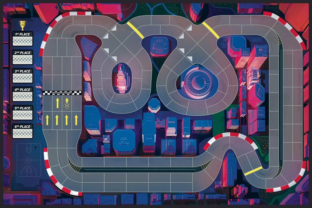Switchback Pass presents dangerous spaces. Cars may move through such spaces only to pass other cars and may not end their turn on one. Crosstown Speedway features two crossover loops, where cars in the rear can block cars ahead of them, and split areas of the track, where players must choose between the shorter single-lane section or the longer, more wide open section.