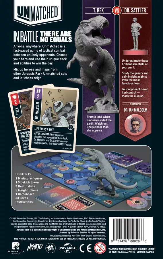 “Dinosaurs eat manβ¦ Woman inherits the earth.” The greatest predator the world has ever known is closing in on the tenacious Dr. Sattler. Who has the slightest idea what to expect? InΒ Unmatched: Jurassic Park β Dr. Sattler vs. T. Rex, the massive T rex unleashes fearsome attacks and seems unstoppable while Dr. Sattler makes full use of her surroundings and the aid of Dr. Ian Malcolm and his chaos theory. Who will become extinct first?