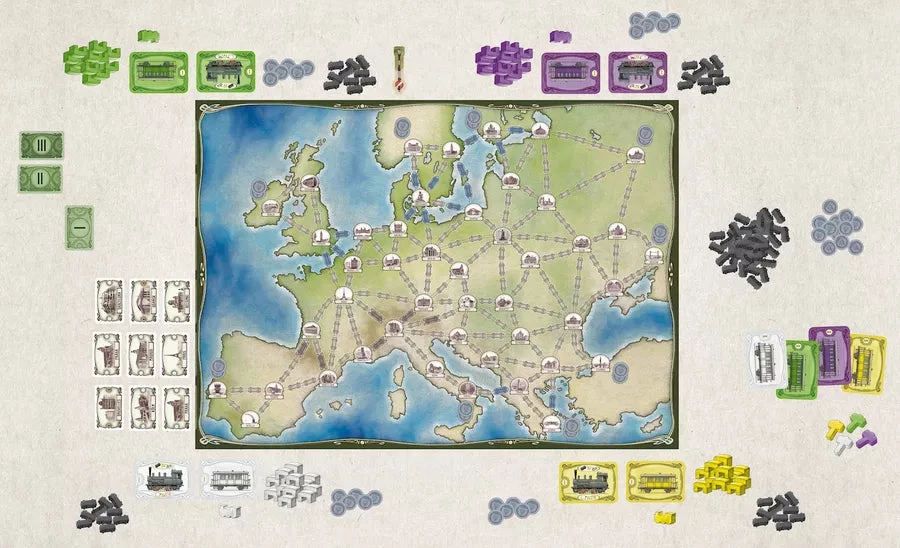 InΒ Free Ride, you are one of several people in charge of building railway lines, connecting the cities in Europe, and carrying passengers to those cities. The game board shows 45 cities connected by a network of potential routes, and all railway lines built will be one of three types: lines owned by you, lines owned by fellow players, and state-owned lines. When you travel along railway lines, you pay nothing to travel on your lines and state-owned lines. To travel on a fellow playerβs line, however, you must pay them 1 coin, which converts their line to state-owned. From then on, traveling on that line is free for all players. As coins are limited, you should carefully balance the building of your lines with the conversion of fellow players’ lines to state-owned lines.