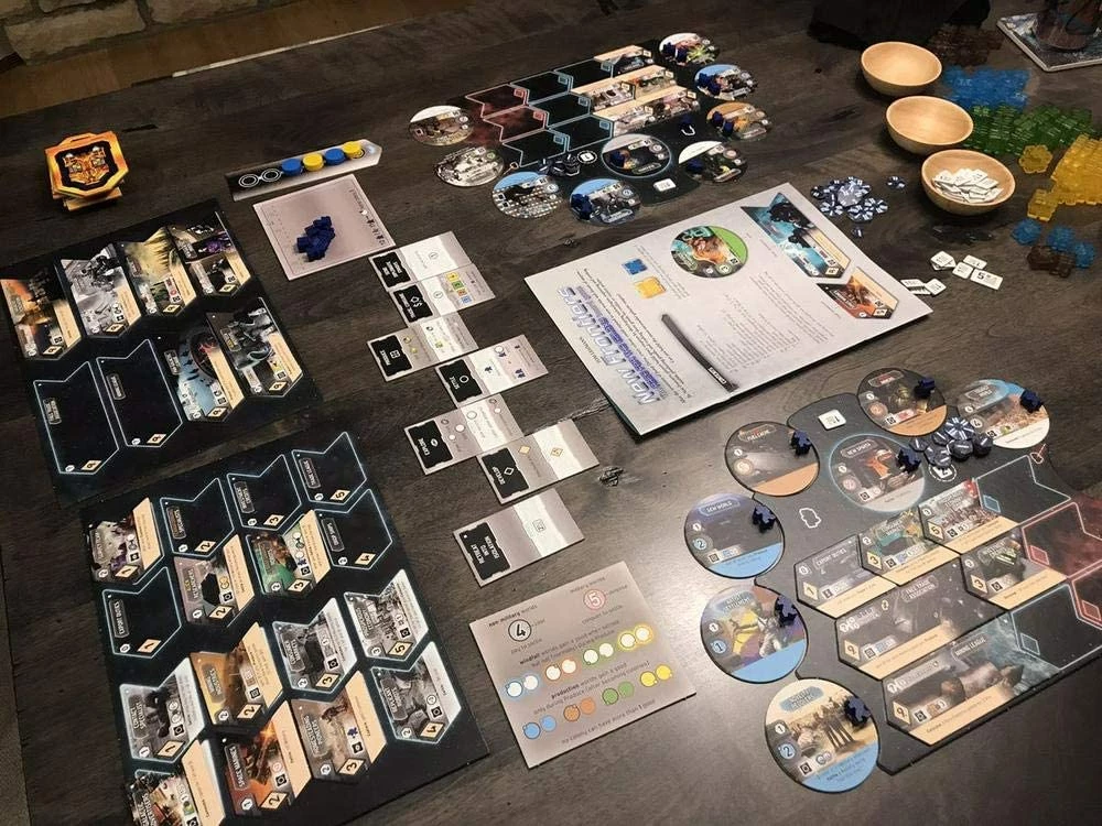 Play continues until one or more of four game ending conditions is reached. After all actions for that round have been done, the player with the most victory points from settled worlds, developments, 9-cost development bonuses, and VP chips earned from consuming goods wins.