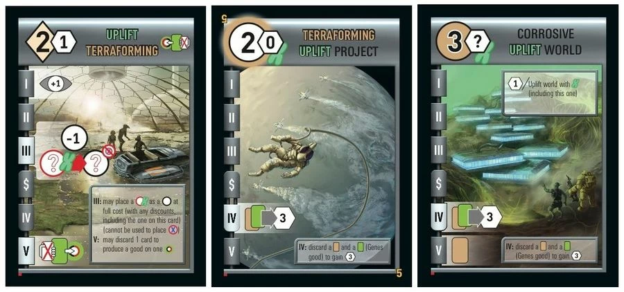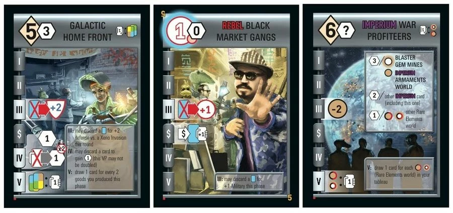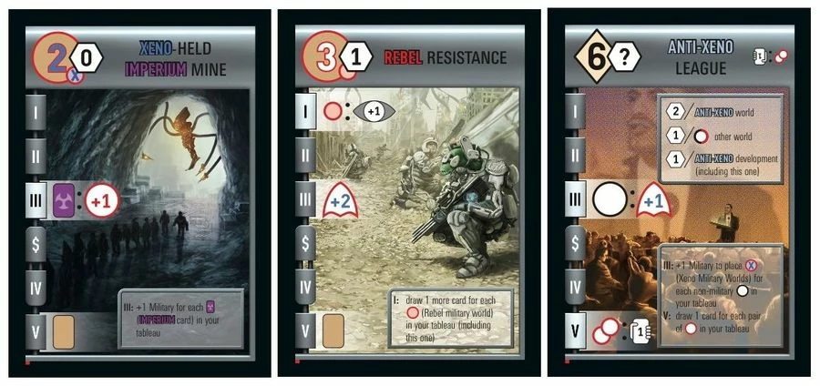 The Invasion game adds two new ways the game can end: by either repulsing or falling to the Xenos. In Produce, players can repair damaged worlds and donate goods to the war effort (earning VPs). Players can also earn VP awards by defeating their share of the Xeno attackers and having the highest military vs Xenos, while they lose the use of damaged worlds that they fail to defend (until they are repaired). The Xeno attacks take place at the end of each round, starting with round 3, and typically take less than 30 seconds to resolve so that players can immediately return to selecting their actions for the next round.