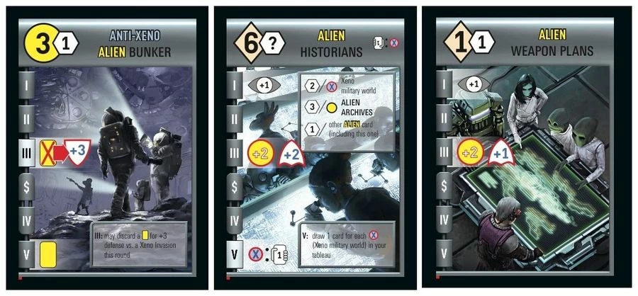 Race for the Galaxy: Xeno Invasion, an expansion for theΒ RftGΒ base game that comprises the third story arc in the game series, depicts the galaxy as being under attack by waves of violently xenophobic aliens, dubbed the Xenos.Β XIΒ adds Xeno military worlds (worlds conquered and occupied by them), specific military vs. Xenos, and a new keyword: ANTI-XENO. To provide a good proportion of new Xeno worlds, keyword, and powers,Β XIΒ is not compatible with the other expansion story arcs.