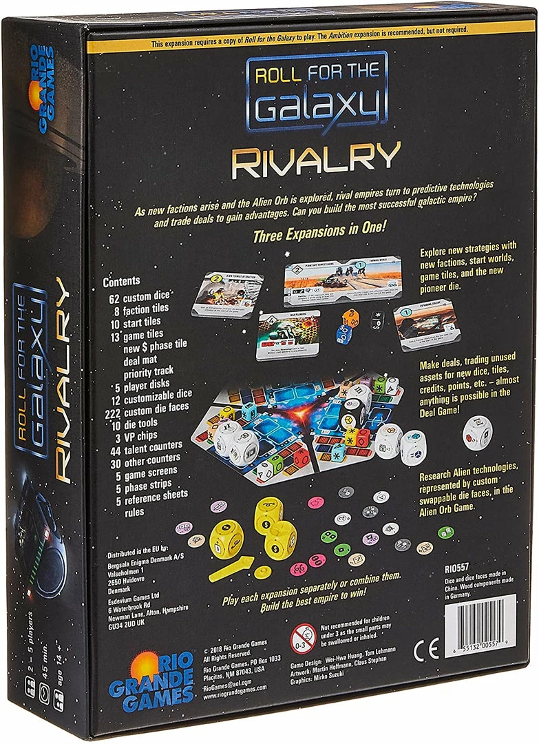Roll for the Galaxy: Rivalry, the second expansion for Roll for the Galaxy, consists of three expansions in one box.