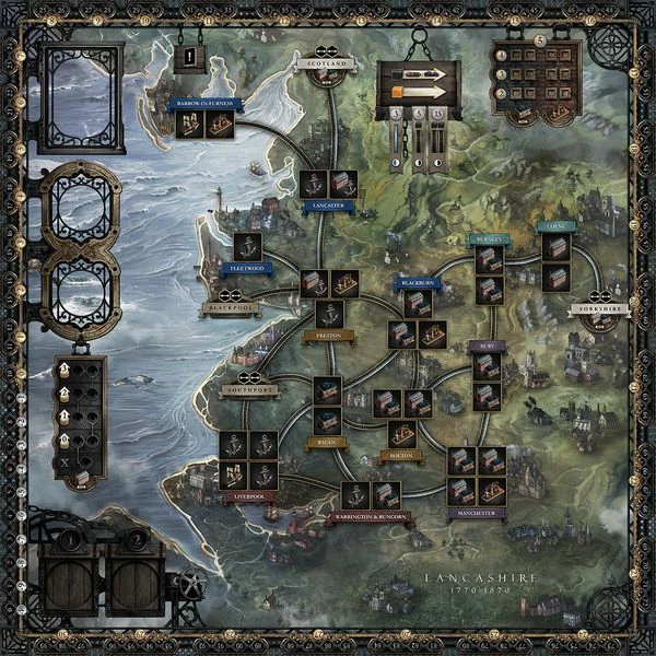 Brass: Lancashire — first published as Brass — is an economic strategy game that tells the story of competing cotton entrepreneurs in Lancashire during the industrial revolution. You must develop, build, and establish your industries and network so that you can capitalize demand for iron, coal and cotton. The game is played over two halves: the canal phase and the rail phase. To win the game, score the most victory points (VPs), which are counted at the end of each half. VPs are gained from your canals, rails, and established (flipped) industry tiles. Each round, players take turns according to the turn order track, receiving two actions to perform any of the following: