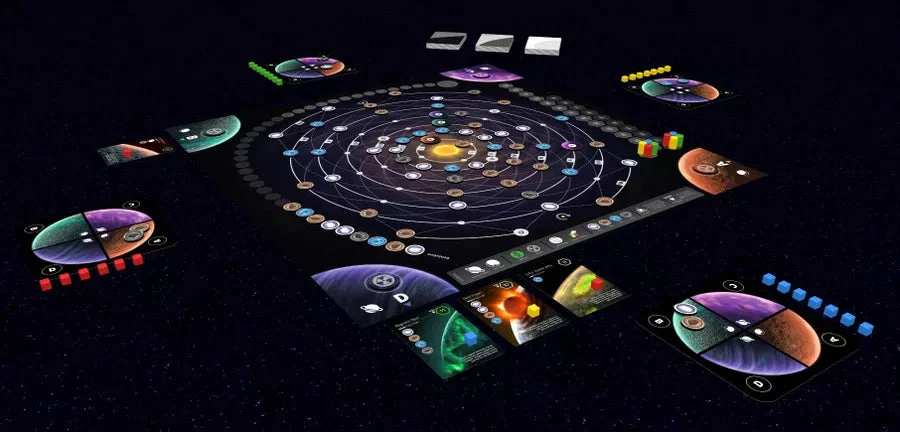 Players are competing to crash combinations of elements onto planets that then allow them to play cards to evolve the planets in a variety of ways, with each player looking to evolve planets in the system to suit their own secret endgame goals.